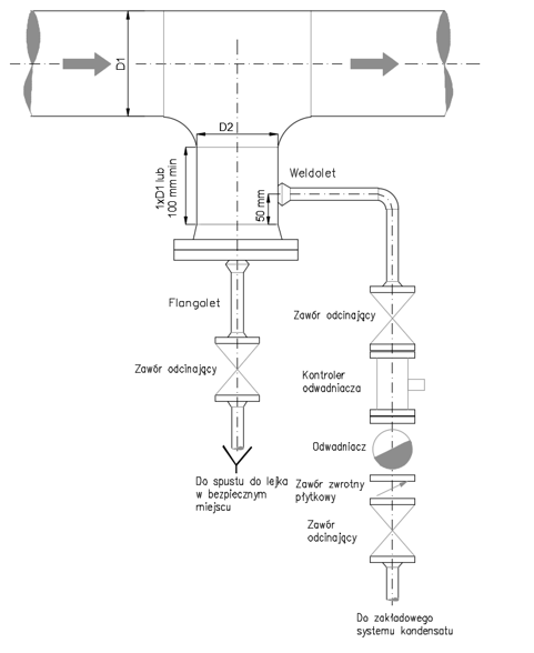 Odwodnienie kondensatu pary wodnej jest realizowane w tzw garnkach kondensacyjnych. Nie ma na to norm ale może tak to wyglądać:
