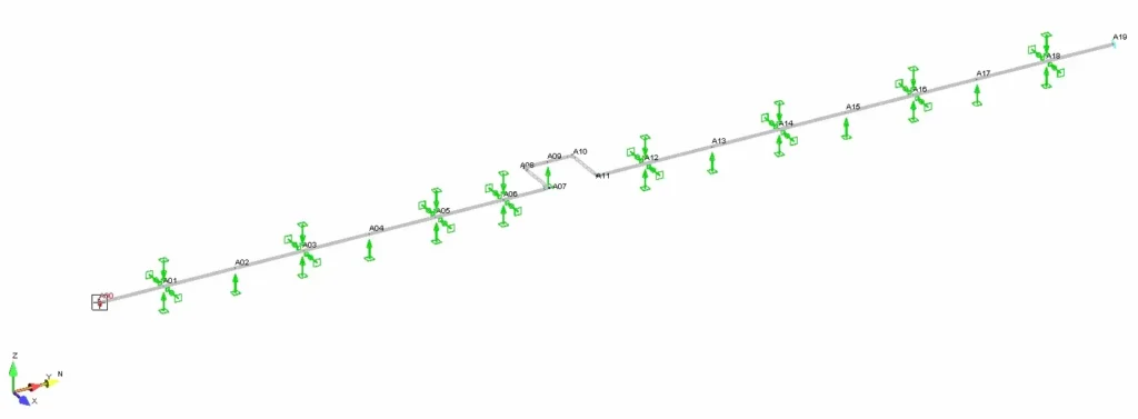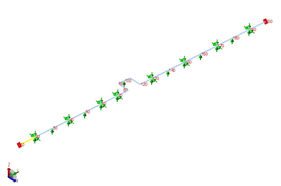 W tym wpisie spróbuję porównać wyniki z dwóch programów dla identycznego modelu. Jest to odcinek rurociągu na estakadzie ze specjalnie wprowadzonym brakiem symetrii na podporach. Chodziło mi o to, aby nie było to odbiecie lustrzane względem środka U-kształtu. Dane rurociągu: 4′, STD, A106-B, CA=0mm. Model w AutoPipe wygląda tak: