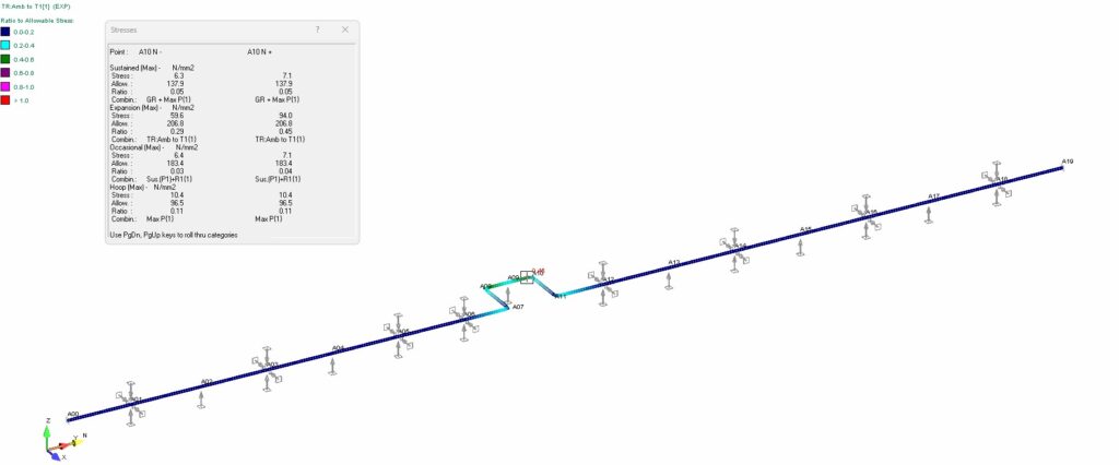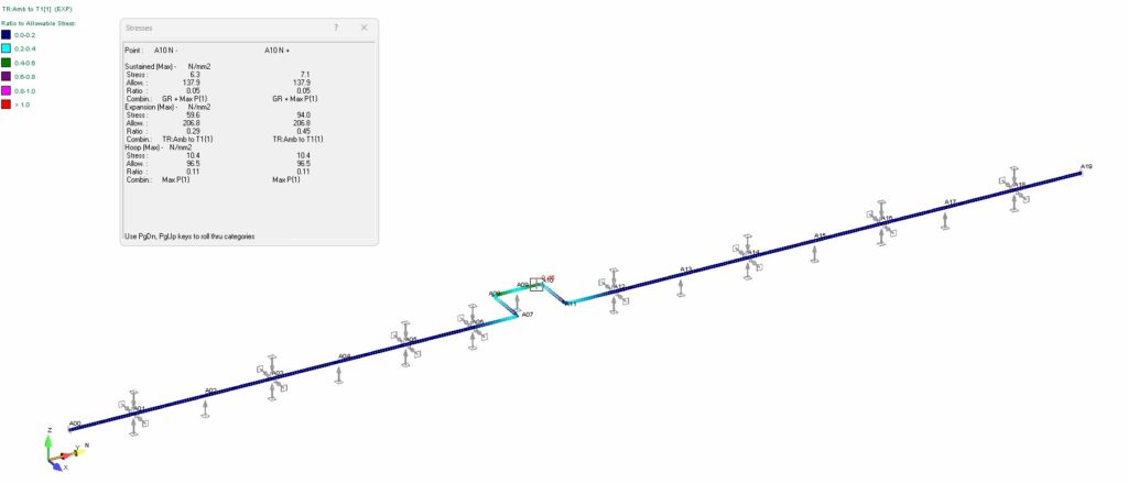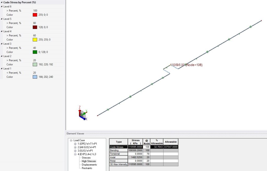 Wyniki statyczne na Caesar II są podobne. Wytężenie dla tej samej kombinacji obciążenia wynosi 33 %.