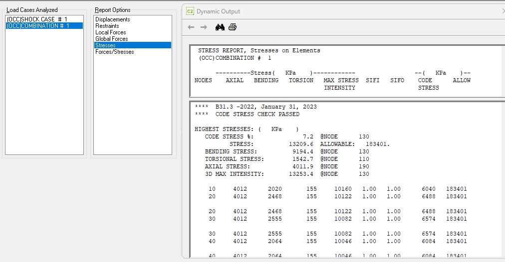 Niestety wyniki analizy dynamicznej Caesara II pozostawiją wiele do życznia. Po pierwsze nie otrzymujemy tego w formie graficznej tylko liczobwej. Musimy zatem opuścić sekcję dynamiki i otworzyć sekcję Inpot, aby zobaczyć gdzie jest węzeł i największym wytężeniem. JEST TO FATALNE ROZWIĄZANIE.