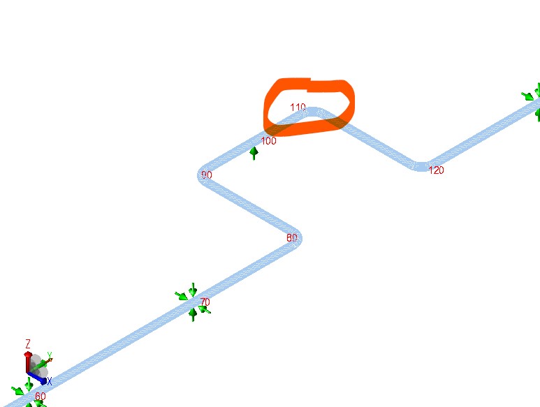 Wynik dla analizy statycznej w AutoPipe jest typowy i nie budzi niepokoju. Wytężenie na łuku wynosi od 29 do 45 %.