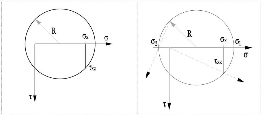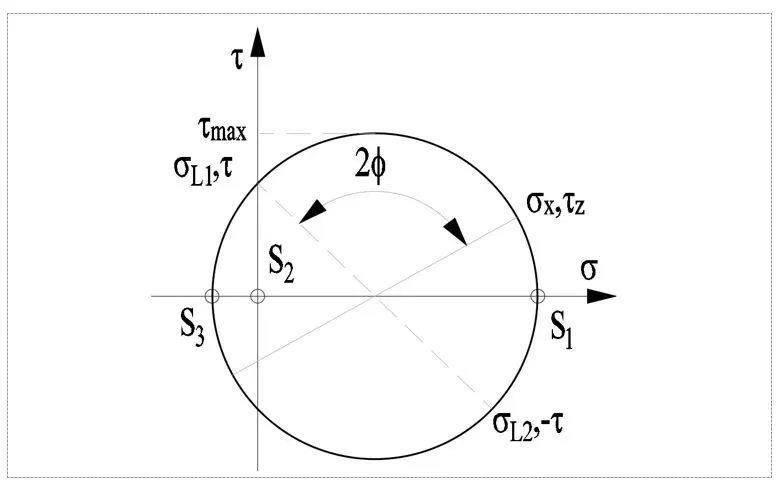 Tradycyjne naprężenia główne były wyznaczane za pomocą serii prostych konstrukcji z dziedziny geometrii analitycznej zwanych kołem Mohra, którego przykład podano poniżej.