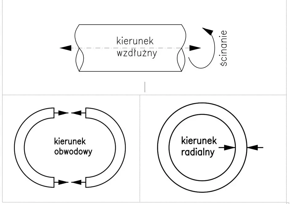 Przyjmijmy lokalny układ współrzędnych o charakterystycznych dla układu rurociągów nazewnictwie: naprężenie podłużne (naprężenie wzdłuż rury), naprężenie obwodowe (lub naprężenie obwodowe na obwodzie) i naprężenie promieniowe przechodzące przez ściankę rury. Przedstawione je na poniższym rysunku.